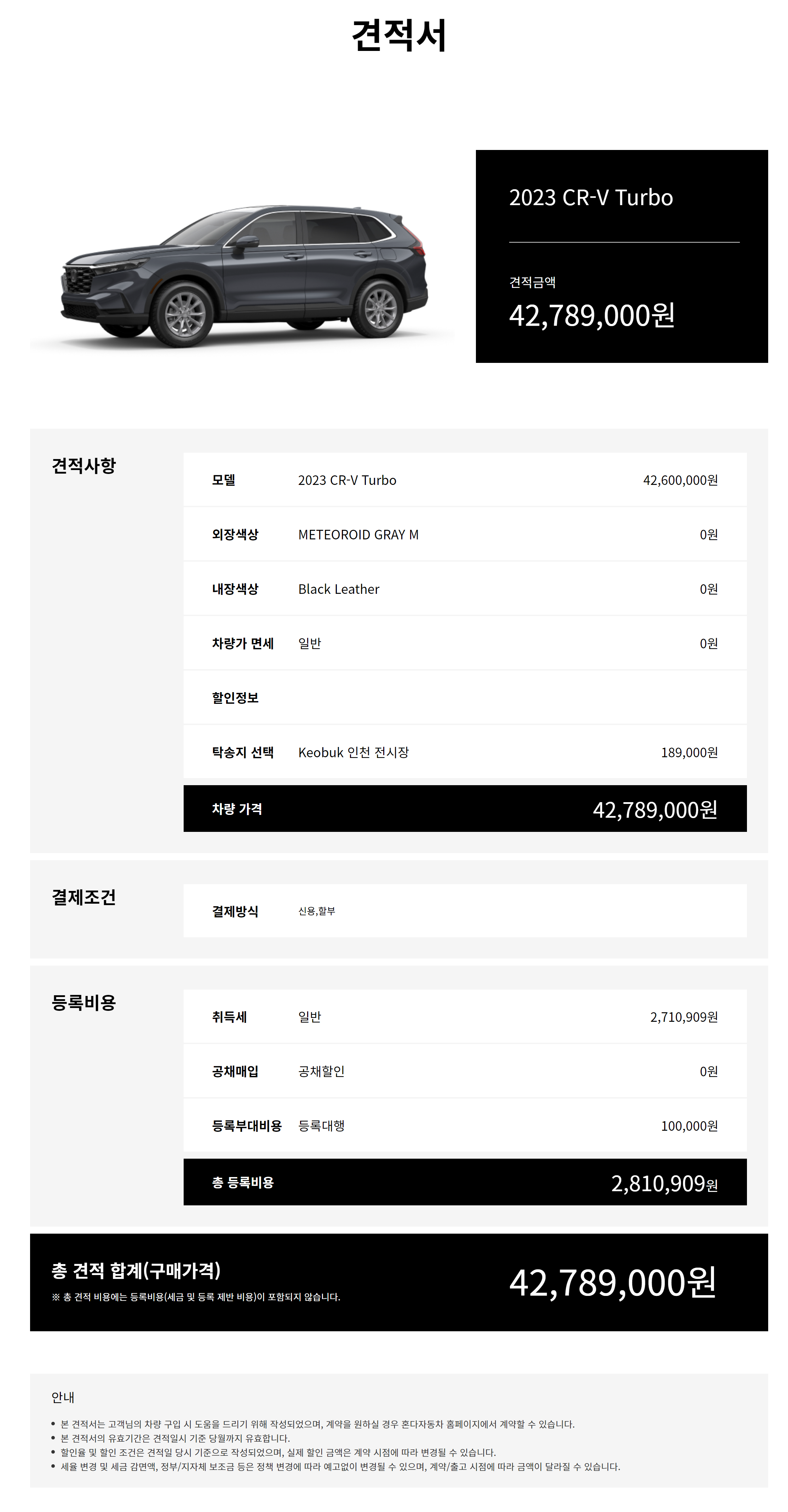 *스타일리시하고 세련된 디테일: CR-V의 디자인은 넓고 수평적인 프론트 그릴, 깔끔하게 정리된 트렁크 패널, 전체 디자인과 매끄럽게 연결되는 범퍼 라인이 조화를 이룹니다. 이러한 디테일은 스포티한 스타일링에 기여하며 안정감과 우아함을 연출합니다.
