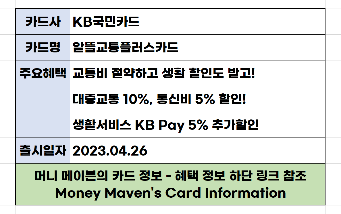 | KB국민 카드 알뜰교통플러스카드 카드혜택 가입행사 가입 팁 가입 혜택 (0) | 2023.07.16 |