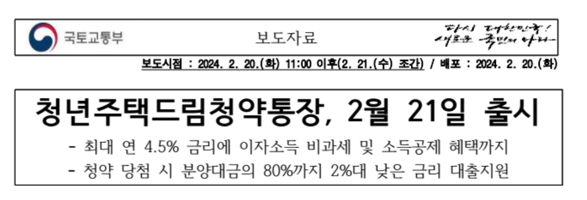 | 청년주택드림청약통장 '정부 공식 보도자료' 먼저 보세요 (0) | 2024.02.24 |