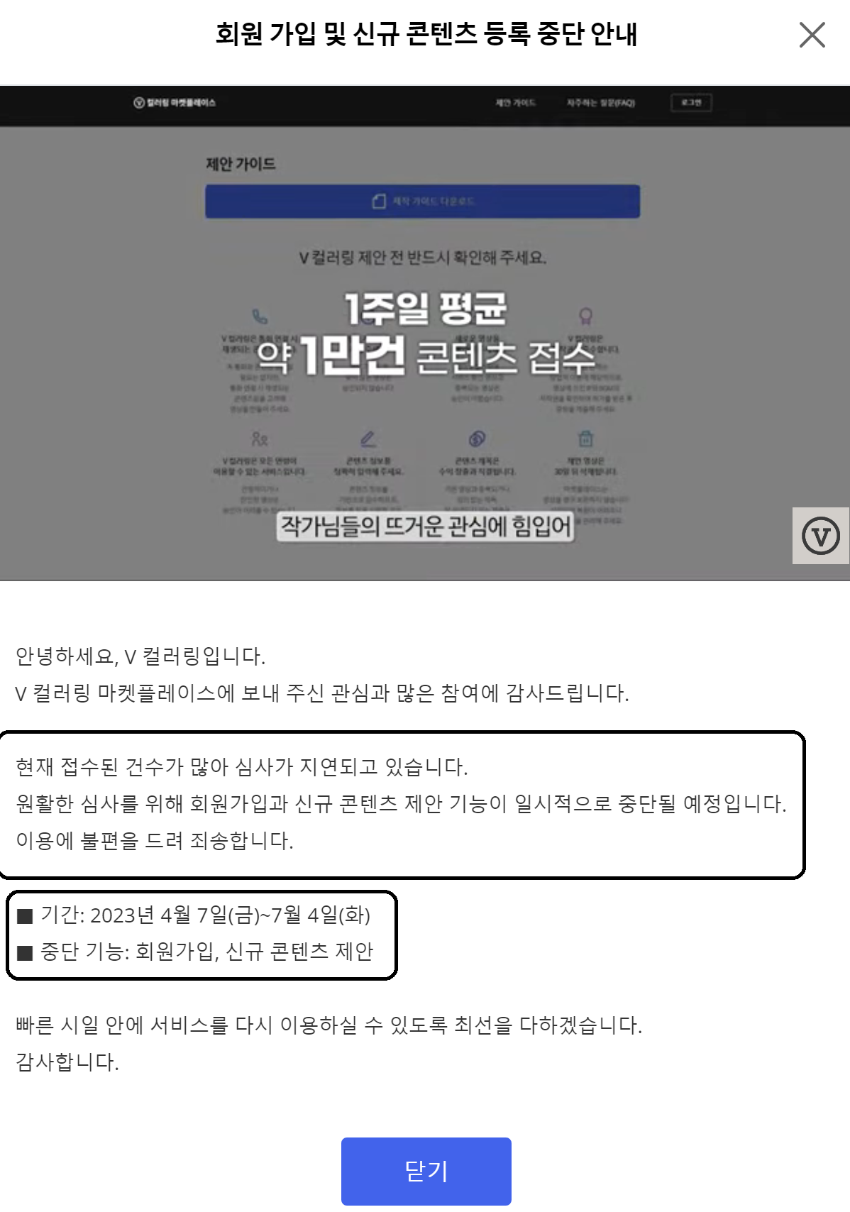 4. 기존 - (2023년 4월 ~ 7월 4일) V컬러링 부업 - 엄청난 인기와 영상 업로드로 심사 지연, 신규 가입 제한 수준 까지 옴