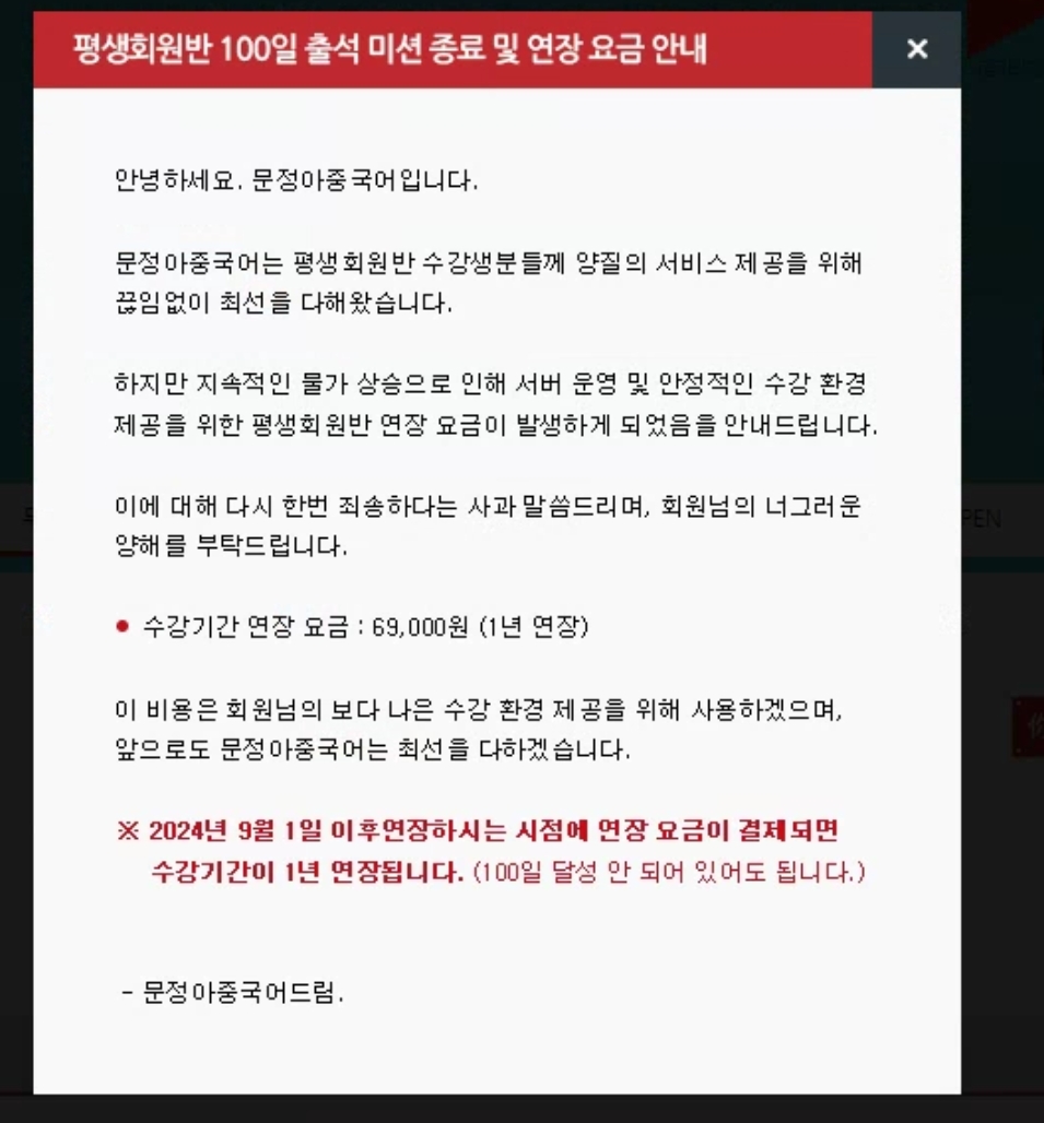문정아중국어는 그동안 '평생회원반'이라는 상품을 통해 고객이 평생 동안 강의를 수강할 수 있는 혜택을 제공해왔습니다. 많은 소비자들이 한 번 구매로 무제한 수강이 가능하다고 믿고 이 서비스를 선택했지만, 최근 기존 회원들에게 연간 69,000원의 추가 요금을 지불해야 연장이 가능한 새로운 조건을 도입하면서 논란이 일고 있습니다.